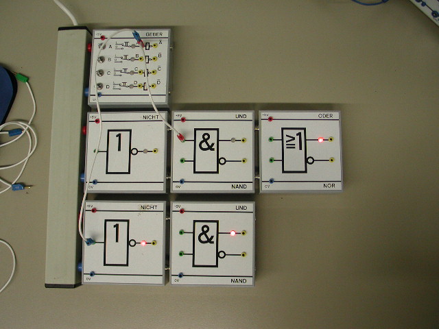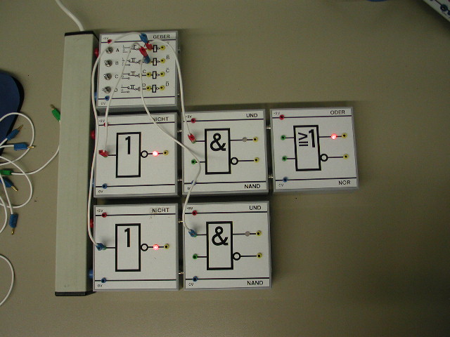 kann man die Kabel ineinander stecken. Das Gleiche wird mit B gemacht. Nun kommt die Verkabelung der Bausteine untereinander: Die Ausgänge der NICHT-Bausteine werden mit den Eingängen der UND-Bausteinen verbunden. Schließlich werden die normalen Ausgänge der UND-Bausteine mit